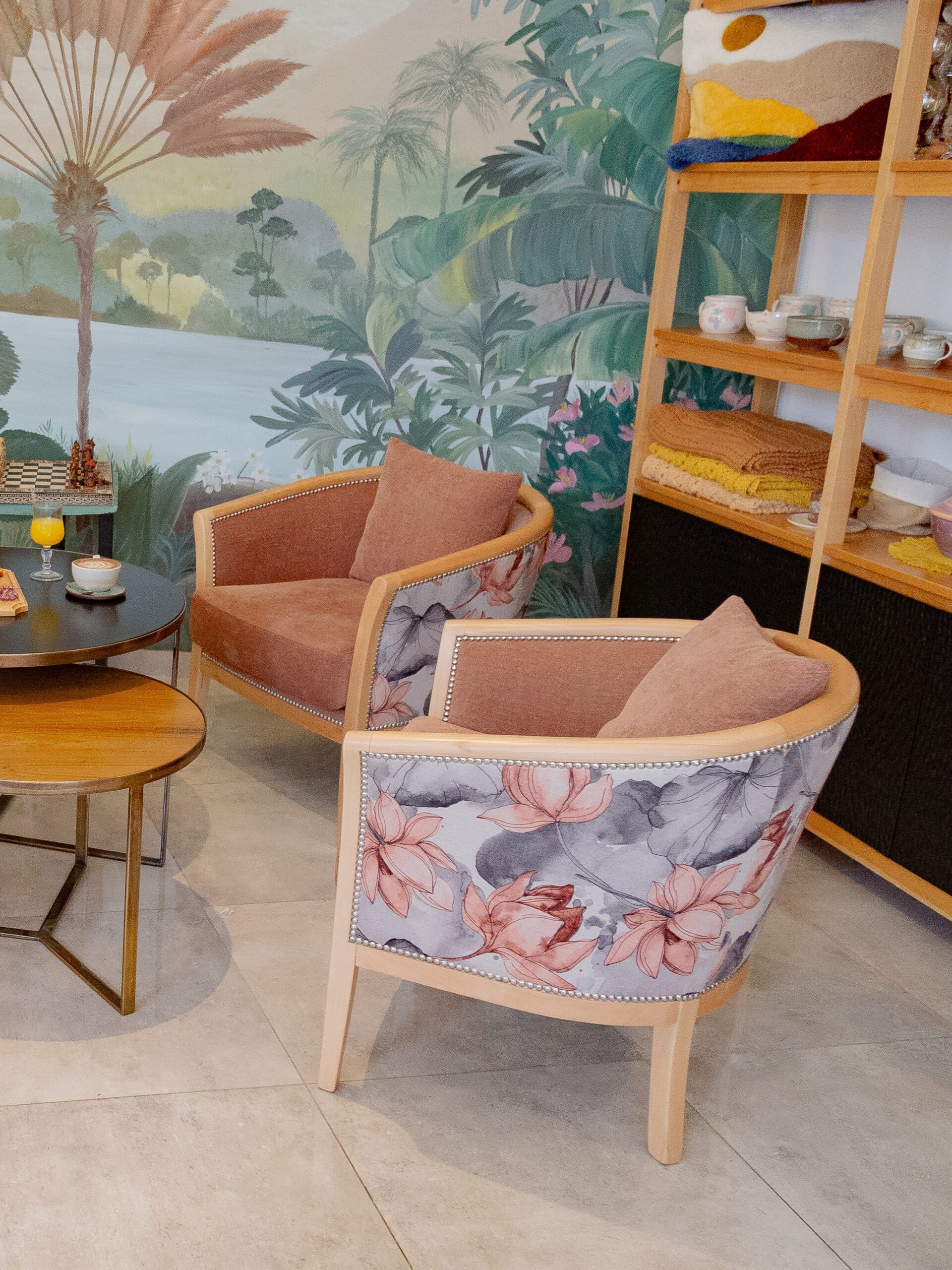 asiento bajo ciruclar con un respaldo de formas de petalos. tapizado en su totalidad