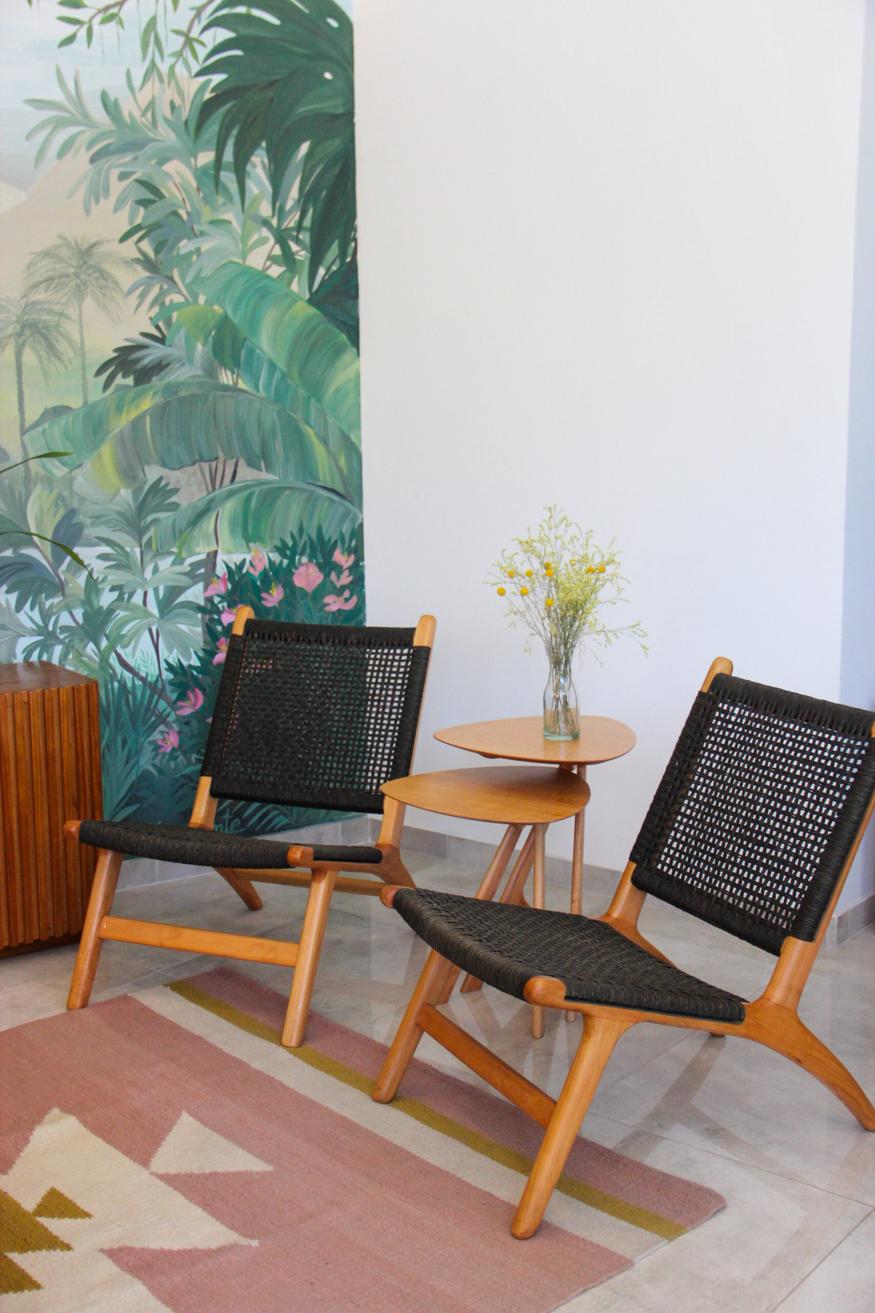 Respaldo inclinado, con asiento tejido artesanal dando un confort para un descanso pleno