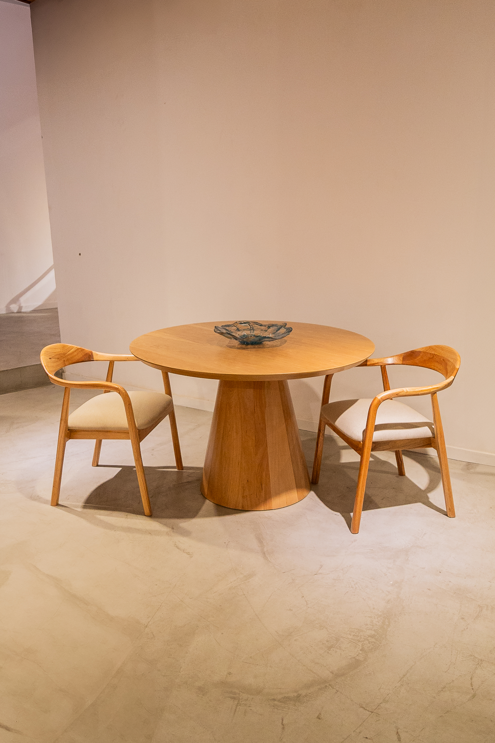 por su mesa redonda en madera clara con una base central robusta y tallada. El borde superior presenta un delicado trabajo ornamental que realza su carácter sofisticado.
