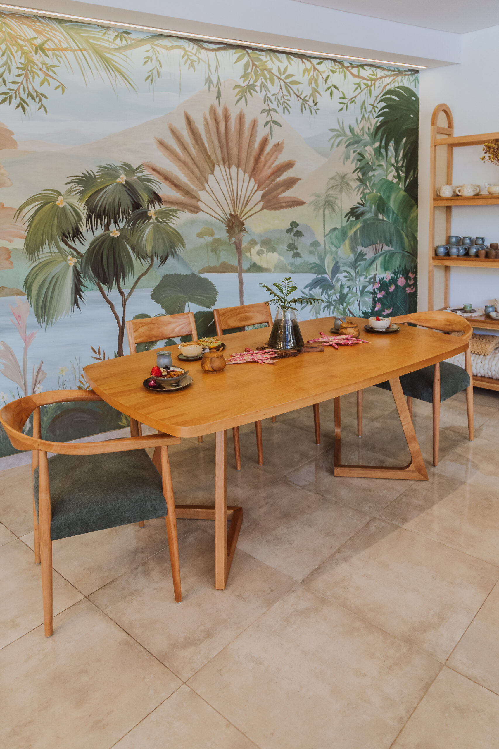 por su mesa redonda en madera clara con una base central robusta y tallada. El borde superior presenta un delicado trabajo ornamental que realza su carácter sofisticado.