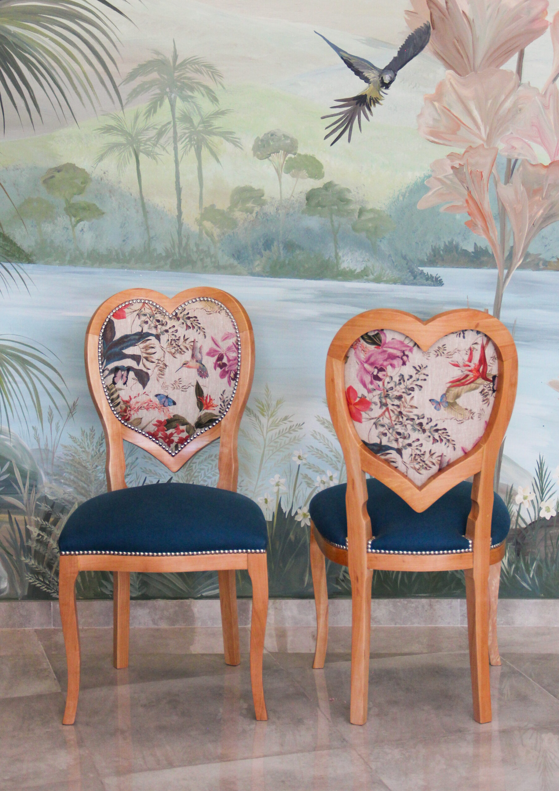 Respaldo en forma de corazon con un asiento tapizado con detalles en tachas plateadas