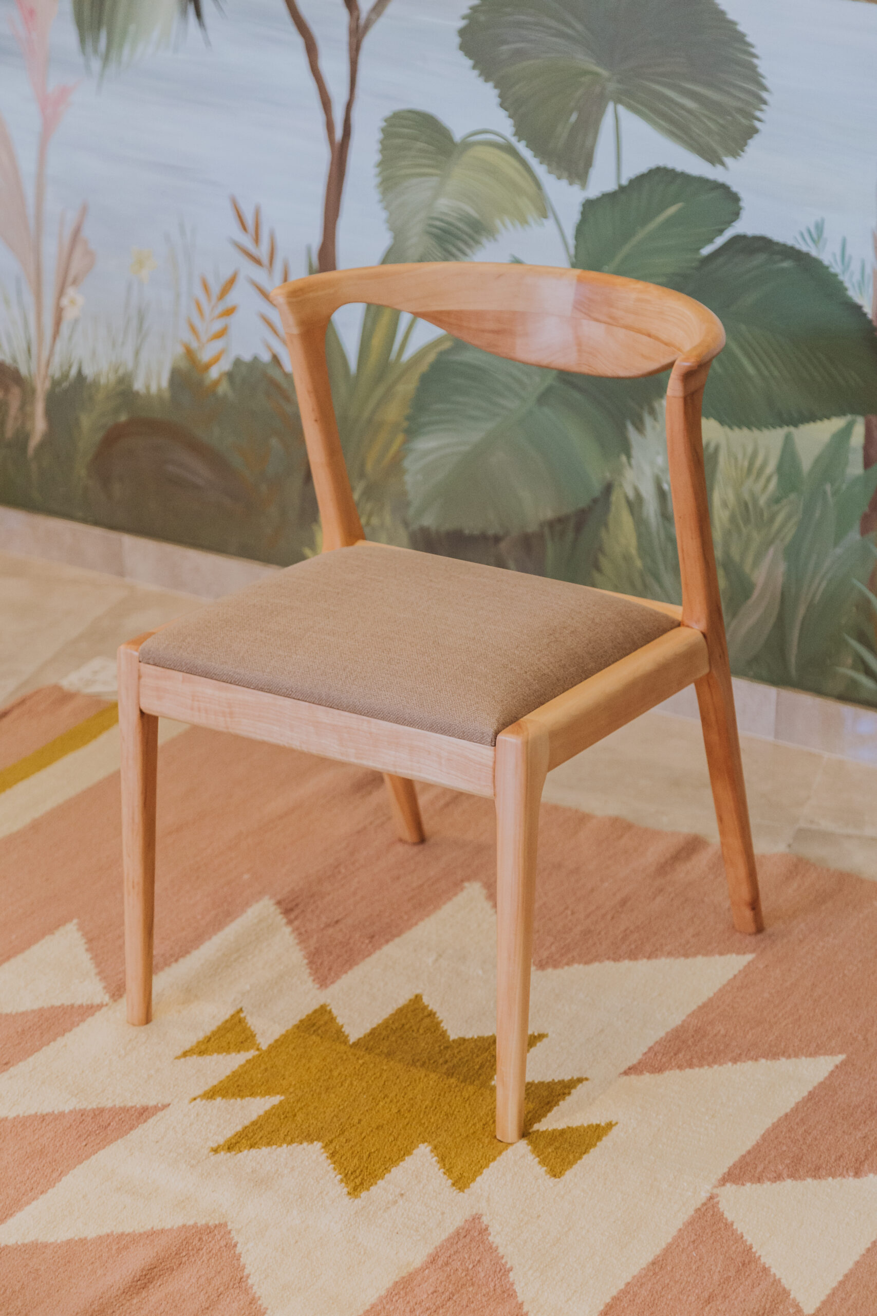 sus patas medio curvas con un respaldo que acompaña cuerpo con colores calidos en madera lenga